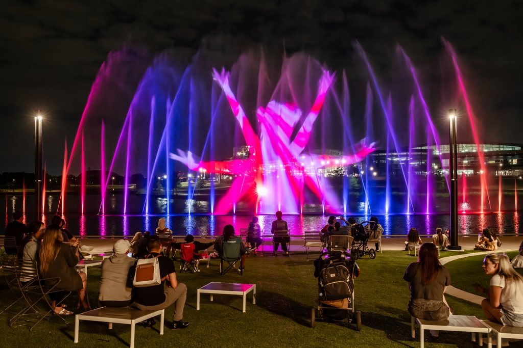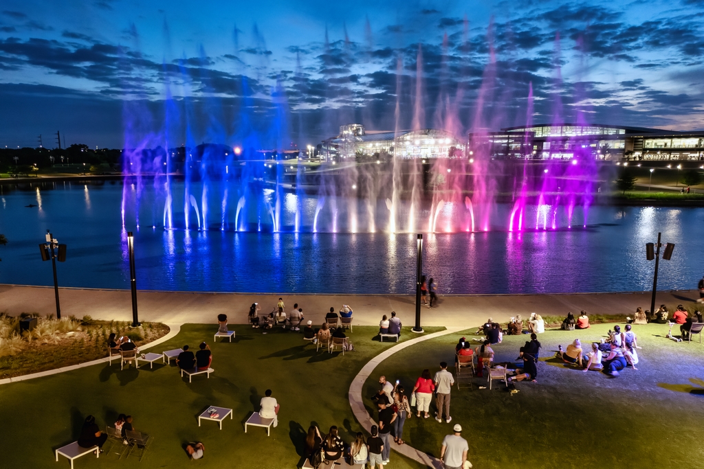In 2022, our team was asked to design and construct a show fountain at EpicCentral, a site that already contained five lakes and was planned to house an entertainment district featuring restaurants, theme parks and hotels. We developed the concept for a show fountain at the largest lake at EpicCentral called “Illuvia”, featuring large-scale projection, specialty lighting effects, and music on four acres of water.